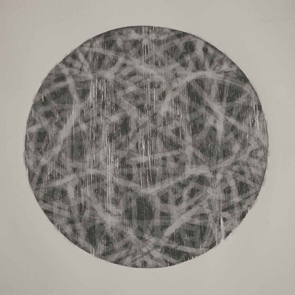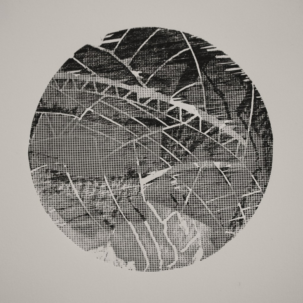 The digitally constructed imagery of the previous exhibition, Turning Over, provided a jumping-off point for Erosion. With it came a welcome return to the physicality of carving and the textural surface quality that comes from the grain of the blocks and the layering of ink. The dense linear elements of the previous works have been pared back and simplified; the referential imagery has become abstracted; a dominant focus has been placed on the elements of pattern and tone. Working in monochrome and adhering to a circular format have offered additional ways of freeing these characteristics from their origins in the built environment, allowing a new format to emerge.